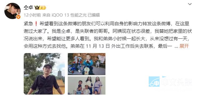 同日,演员仝卓在社交平台发文求助称,其表弟李怡亨于11月13日外出打工后与家人失联,怀疑遭诱骗至境外电诈园区受控。李怡亨母亲亦通过社交媒体证实儿子失踪,称多日来无法获取任何确切信息。家属已向相关部门求助,目前正等待进一步调查结果。 |