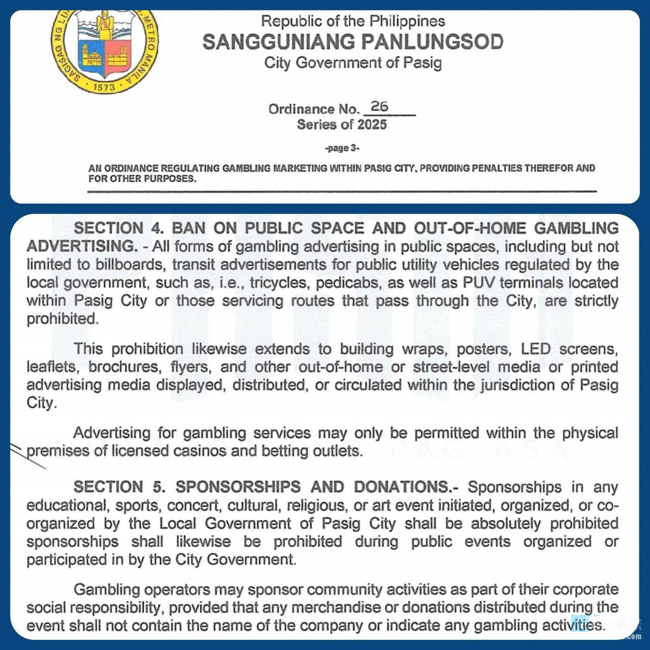 菲律宾帕西格市市长 Vico Sotto 12月8日宣布,市议会已通过 2025年第26号市条例,全面禁止在帕西格市宣传或刊登任何形式的赌博广告。